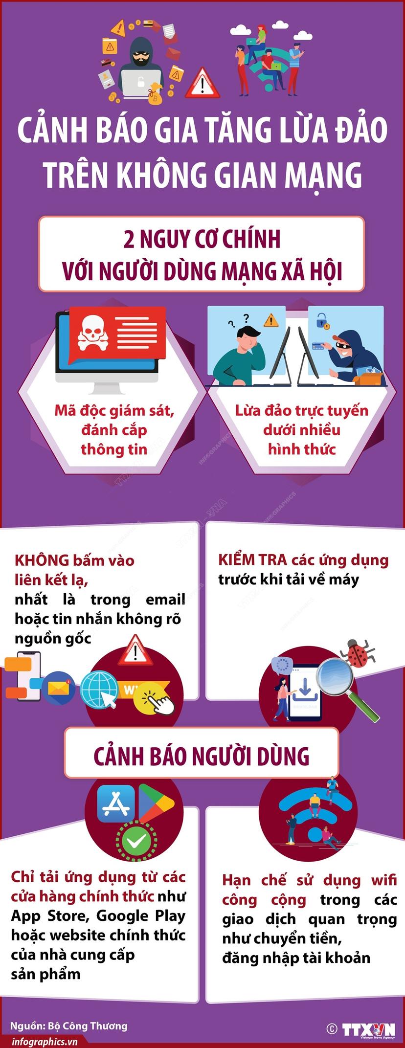 (Theo TTXVN)- Đại diện Trung tâm Phát triển thương mại điện tử (Ecomviet) – Cục Thương mại điện tử và Kinh tế số (Bộ Công Thương) đưa ra cảnh báo việc lừa đảo qua mạng sẽ tiếp tục diễn biến phức tạp trong thời gian tới. Dự báo, hai nguy cơ chính người dùng mạng xã hội sẽ phải đối mặt đó là mã độc giám sát, đánh cắp thông tin và lừa đảo trực tuyến biến thể.