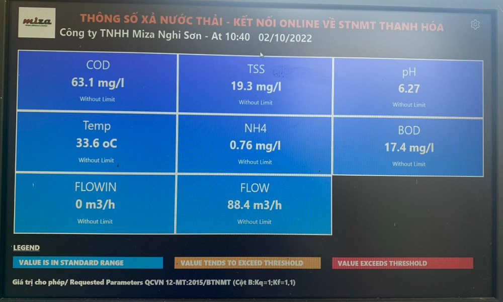 Đặc biệt, Miza Nghi Sơn còn có thêm hệ thống xử lý kỵ khí với công nghệ tiên tiến nhất (Tháp kỵ khí IC..) giúp loại bỏ TSS, BOD, COD, màu, mùi. Hệ thống xử lý cấp 3: Xử lý oxi hóa khử bằng các bể phản ứng Fenton loại bỏ COD trơ, BOD, Màu, mùi và hệ thống vận hành kiểm soát DCS – tự động 100%. Chất lượng nước thải ra môi trường vì thế đạt tiêu chuẩn gần mức A (theo QCVN12-MT:2015/BTNMT và QCVN40:2011/BTNMT), trong khi giấy phép xả thải chỉ yêu cầu tiêu chuẩn B.