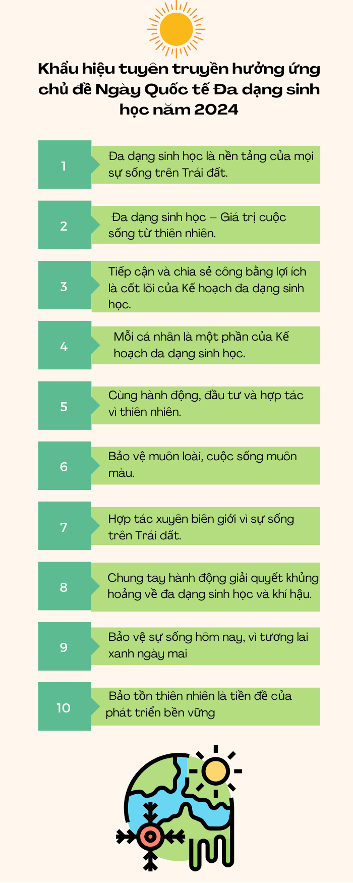 Hưởng ứng Ngày Quốc tế đa dạng sinh học năm 2024, UBND tỉnh Quảng Nam đưa ra 10 khẩu hiệu tuyên truyền là: Đa dạng sinh học là nền tảng mọi sự sống trên trái đất; đa dạng sinh học – giá trị cuộc sống từ thiên nhiên; Tiếp cận và chia sẻ lợi ích cốt lõi của Kế hoạch đa dạng sinh học; Mỗi cá nhân là một phần của kế hoạch Đa dạng sinh học; Cùng hành động, đầu tư và hợp tác vì thiên nhiên; Bảo vệ muôn loài, cuộc sống muôn màu; Hợp tác xuyên biên giới vì sự sống trên trái đất; Bảo vệ sự sống hôm nay vì tương lai xanh ngày mai; Bảo tồn thiên nhiên là tiền đề phát triển bền vững.