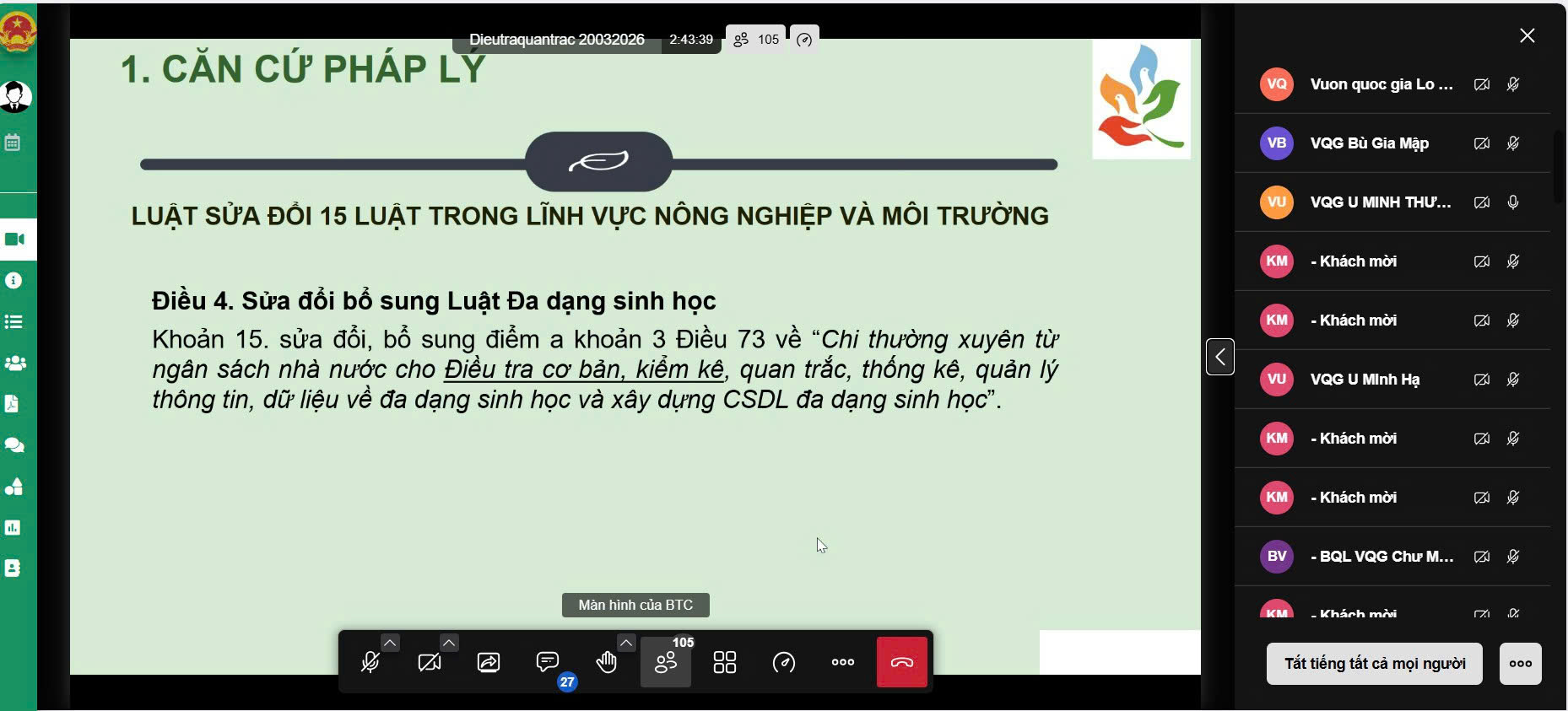 Hội thảo được tổ chức theo hình thức kết hợp trực tiếp và trực tuyến, kết nối các điểm cầu tại địa phương và các đơn vị liên quan, tạo điều kiện thuận lợi để đại biểu cùng tham gia, trao đổi và thảo luận. Tham dự Hội thảo có đại diện Sở Nông nghiệp và Môi trường; Ban quản lý các Vườn quốc gia, Khu bảo tồn thiên nhiên cùng các đơn vị liên quan đến công tác bảo tồn thiên nhiên và đa dạng sinh học trên phạm vi cả nước.