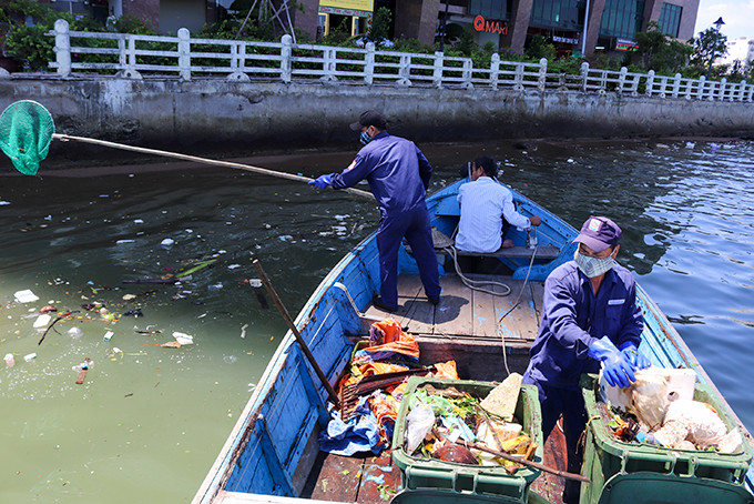 Công nhân vệ sinh thu gom rác thải trên biển Nha Trang. |