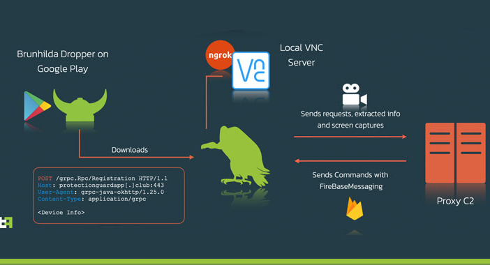 Hơn nữa, Vultur sử dụng ngrok (cho phép hiển thị máy chủ cục bộ ở phía sau tường lửa ra ngoài mạng internet thông qua các đường hầm an toàn) để cung cấp quyền truy cập từ xa vào VNC trên điện thoại. Ngoài ra, nó cũng thiết lập kết nối với máy chủ C&C để nhận lệnh điều khiển thông qua dịch vụ gửi thông báo của Google (Firebase Cloud Messaging – FCM ), sau đó thông tin dữ liệu sẽ được trích xuất và được truyền trở lại máy chủ.