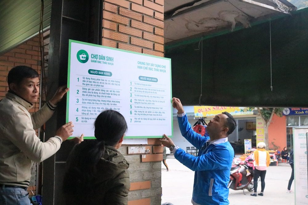 Treo biển tuyên truyền phòng chống rác thải nhựa tại Chợ Chiềng An, thành phố Sơn La.