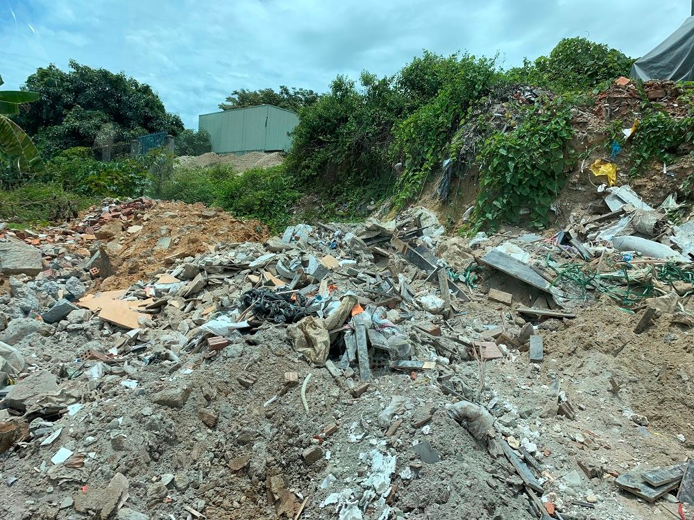 Tương tự tại xã Hoà Châu, ngay dưới chân cầu Đỏ cũng trở thành bãi rác lộ thiên chủ yếu là gạch, đá, vôi vữa – những phế thải xây dựng bỏ đi từ quá trình thi công nhà cửa đổ thành từng ụ lớn. Chỉ trong nửa giờ đồng hồ ghi nhận tại khu vực này, chúng tôi phát hiện chiếc xe ben BKS 43C- 08730 đã có 2 lượt vận chuyển thu gom phế thải, rồi đưa về tập kết trái phép. Không chỉ gây mất mỹ quan đô thị, khói bụi cộng với ô nhiễm môi trường, bãi tập kết phế thải đã trở thành nỗi bức xúc của người dân tổ 5,6, thôn Đông Hoà.