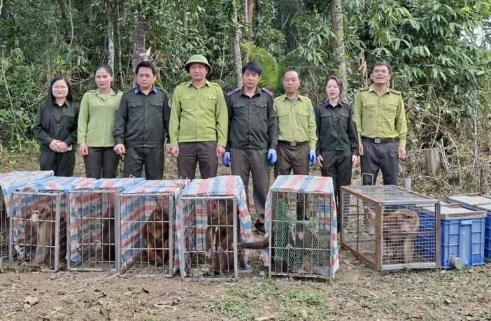 14 cá thể khỉ, gồm 7 khỉ mặt đỏ, 2 khỉ mốc, 3 khỉ đuôi lợn và 2 khỉ vàng được thả về với tự nhiên. Ảnh: Văn Tới