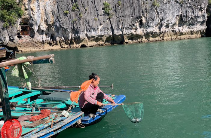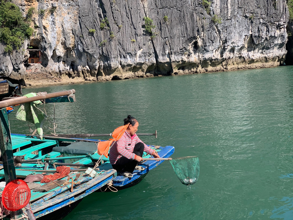 Người dân vớt rác trên Vịnh Hạ Long, góp phần làm cho môi trường vịnh ngày càng xanh, sạch, đẹp.